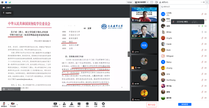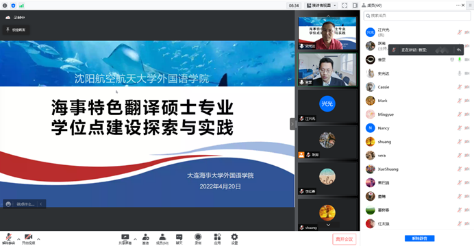 2022年4月20日15:00,大连海事大学外国语学院院长曾罡教授应邀为外国语学院教师做了题为“海事特色翻译硕士专业学位点建设探索与实践”学术讲座。受疫情影响,学术讲座使用腾讯会议平台线上进行。