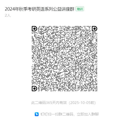 讲座形式为线下授课,不收取任何费用。本系列讲座配有相应的考研英语钉钉群,此群用于发布讲座所需资料,通知每次课授课地点,以及为考研学子答疑解惑,请各位考研学子扫码或搜索群号(44859172)入群。